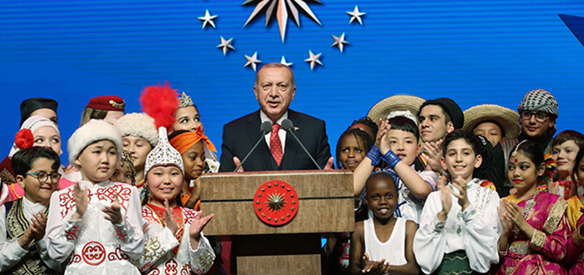 Konuşması esnasında yanına gelen çocuklarla şakalaşan Cumhurbaşkanı Erdoğan, “Yurt dışından gelen misafirlerimizin burada bulundukları süre içinde keyifli anlar yaşayacağına, ömür boyu sürecek kardeşliklerin temelini atacaklarına inanıyorum. Hayatta bir çocuğun gülümsemesinden daha büyük bir mutluluk, bir çocuğun kalbinden daha geniş bir umman yoktur. Savaşların, çatışmaların, açlık ve kıtlıkların ufkumuzu kararttığı bir dönemde dünyayı güzelleştiren yegane şey siz çocukların tebessümüdür. Sizler bizim geleceğimizin teminatı, yarınlarımızın umudusunuz. Siz çocuklar daha huzurlu, neşeli, adaletli, güzel bir dünyanın müjdecisi durumundasınız. Çünkü çocuk olmak coşkulu olmak, dünyaya hep temiz, duru gözlerle bakmak ve yarına o heyecanla yürümek demektir. Çocuk olmak, yüreğindeki sınırsız, hesapsız sevgiye sıkı sıkı sarılmak demektir. Sizlerin yüreğinizdeki sevgi ve umut tomurcuklarının kopartılmasına izin vermeyeceğinize inanıyorum. İyi ve nitelikli bir eğitim aydınlık geleceğimize açılan en önemli kapıdır. Bizlerde son 17 yıldır hükümet olarak eğitimi ana önceliğimiz yaptık, ülkemizdeki eğitimin kalitesini artırmak, eğitimde fırsat eşitliğini sağlamak için gece gündüz gayret gösterdik. Bizim yaşadığımız sıkıntıları sizlerin yaşamaması için gayret gösteriyoruz. Biz sizin yaşınızdayken 70-80 kişilik sınıflarda okuyorduk. Akıllı tahtaların, bilgisayarların, teknolojik araçların olmadığı bir Türkiye’de eğitim hayatımızı sürdürdük. Şimdi okula başladığınızda masalarınızın üzerinde hazır olan ders kitaplarına ulaşmak bile bizim için büyük bir sorundu. Hamdolsun son 17 yılda ülkemize yakışmayan bu eksikleri ortadan kaldırdık. Sizlere daha kaliteli ve etkin bir eğitim ortamı sunmak için önemli adımlar arttık” diye konuştu.