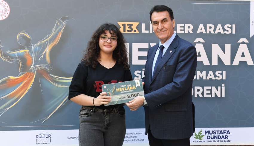 Sanata ve sanatçıya büyük destek veren Osmangazi Belediyesi, Liseler Arası Mevlana Şiir Yarışmasının bu yıl 13’üncüsünü düzenledi. Düzenlenen yarışmaya liseli öğrenciler yazdıkları en güzel şiirleriyle katıldı. Yarışmaya katılan eserler her biri uzman jüri üyeleri Metin Önal Mengüşoğlu, Nesrin Karaca, Sadettin Eğri, Mustafa Beşpınar ve Ercan Yılmaz, tarafından seçilerek derecelendirildi. Yoğun katılımın olduğu yarışmada, Neyden Kalbim eseriyle Fatma Zülal Kaymak birinci, Ensarı Erbaa eseriyle Muhammet Alatar ikinci ve Arayış şiiriyle Hacer Betül Süslü üçüncü oldu. Yarışmada birinciye 8 bin, ikinciye 7 bin üçüncüye ise 6 bin lira para ödülü verildi. Mansiyon almaya hak kazan şiirlerin sahipleri Seda Derman, Zekiye Betül Erkalp ve Canan Akhüseyinoğlu ise 3 bin lira para ödülü almaya hak kazandı. Dereceye giren liseli şairler ödüllerini Osmangazi Belediye Başkanı Mustafa Dündar’ın elinden aldı.