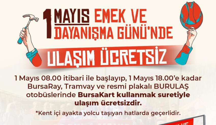 Bursa Büyükşehir Belediye Başkanı Mustafa Bozbey, tüm emekçilerin 1 Mayıs İşçi Bayramı’nı kutladı. Bursa Büyükşehir Belediyesi olarak emeğin ve emekçinin yanında olmaya devam edeceklerini söyleyen Başkan Mustafa Bozbey, “1 Mayıs Emek ve Dayanışma Günü’nde kutlama ve etkinliklerin coşkulu kalabalıklarla yapılabilmesi amacıyla BursaRay ve tramvay hatları ile resmi plakalı Burulaş otobüsleri, 1 Mayıs 2025 Perşembe günü 08.00 ile 18.00 saatleri arasında BursaKart kullanmak suretiyle ücretsiz olarak hizmet verecektir” dedi.
