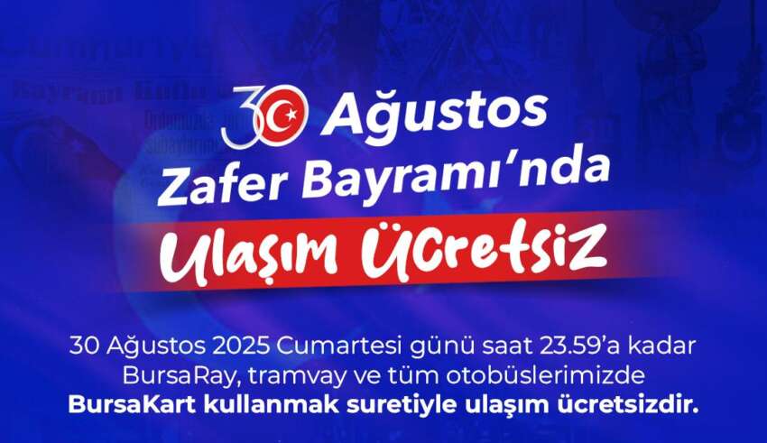 Bursa Büyükşehir Belediyesi tarafından 30 Ağustos Zafer Bayramı kutlama ve etkinliklerinin coşkulu kalabalıklarla yapılabilmesi için BursaRay, Burulaş otobüsleri ve tüm Özel Halk otobüslerinde 30 Ağustos Cumartesi günü saat 23.59’a kadar ulaşımın ücretsiz olacağı belirtildi. Ücretsiz uygulamadan yararlanmak için vatandaşların ulaşım kartlarını kullanmaları gerekirken, uygulama kent içi ayakta yolcu taşıyan hatlarda geçerli olacak.