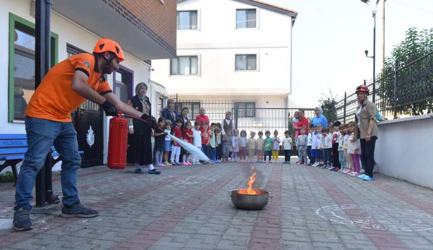 Yıldırım Belediyesi Afet İşleri Müdürlüğü ekipleri miniklere uygulamalı olarak, Temel Afet Farkındalık Eğitimi ve Temel Yangın Eğitimi verdi.