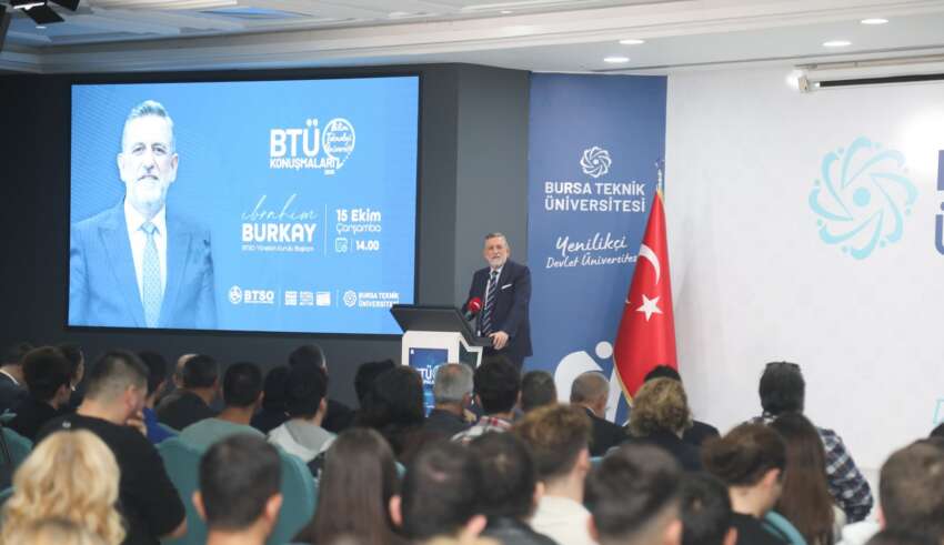 Bursa Teknik Üniversitesi (BTÜ) öğrencilerini her hafta çarşamba ilham veren konuklar ile buluşturan BTÜ Konuşmaları’nın 5. Sezon 43’ncü bölüm konuğu, Bursa Ticaret ve Sanayi Odası (BTSO) Başkanı İbrahim Burkay oldu. Mimar Sinan Yerleşkesi Turkuaz Salon’da gerçekleşen programa; BTÜ Rektörü Prof. Dr. Naci Çağlar, Yıldırım Kaymakamı Metin Esen, Nilüfer Kaymakamı Murat Süzen, BTSO yönetim kurulu üyeleri, iş dünyasından temsilciler, akademisyenler ve öğrenciler katıldı. “Bursa Büyürse Türkiye Büyür” başlıklı konuşmasını yapan İbrahim Burkay, Bursa’nın sadece bir sanayi kenti değil; aynı zamanda geleceğe yön veren projelerin de merkezi olduğunu söyledi. İbrahim Burkay, 60 bin üyeli BTSO’nun; TEKNOSAB, Türkiye’nin ilk uzay temalı eğitim merkezi GUHEM, iş dünyasının yeni eğitim üssü Bursa Business School ve BTSO Eğitim ve Teknoloji Merkezi gibi önemli projeleri hayata geçirdiğini belirtti.
