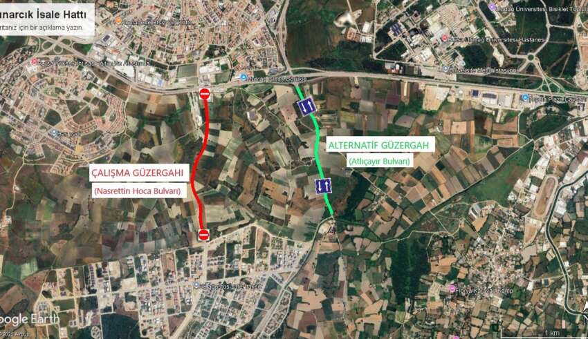 BUSKİ Genel Müdürlüğü İçmesuyu Dairesi Başkanlığı tarafından yapılacak Çınarcık Su Projesi isale hattı çalışmaları kapsamında Nilüfer İlçesi, Kurtuluş Mahallesinde Nasrettin Hoca Bulvarı’nın İzmir Yolu caddesi bağlantısından Örencik Caddesi kesişimine kadarki kısmı 17 Ekim 2025 – 17 Kasım 2025 tarihleri arasında trafiğe kapatılacak olup ulaşım alternatif güzergahlardan sağlanacaktır. Çalışmalar süresince sürücülerin trafik işaret ve işaretçilerine uymaları gerekmektedir.
