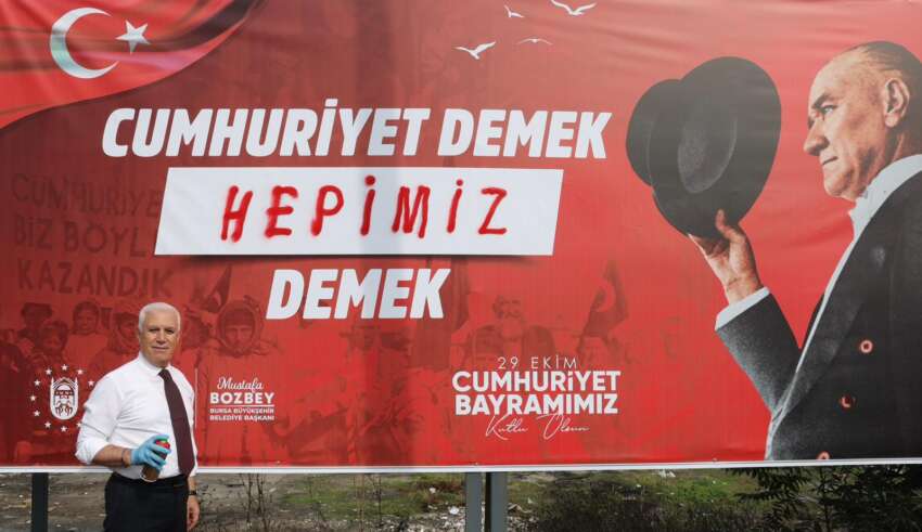 Kampanyaya ‘Cumhuriyet demek, hepimiz demek’ diyerek katılan Bursa Büyükşehir Belediye Başkanı Mustafa Bozbey de sloganını billboarda sprey boyayla yazdı. 29 Ekim’de Cumhuriyet Bayramı coşkusunu yaşamak için tüm Bursalıları alanlara davet eden Başkan Mustafa Bozbey, “Cumhuriyet demek, hepimiz demek. Cumhuriyet demek, aydınlanma demek. Cumhuriyet demek, bağımsızlık demek. Cumhuriyet demek, vatan demek. Cumhuriyet demek, Atatürk demek. Onun için Cumhuriyete sahip çıkmak hepimizin sorumluluğudur. Hep birlikte en büyük bayramımızı kutlayalım. Cumhuriyeti gelecek kuşaklara hep birlikte taşıyalım” dedi.