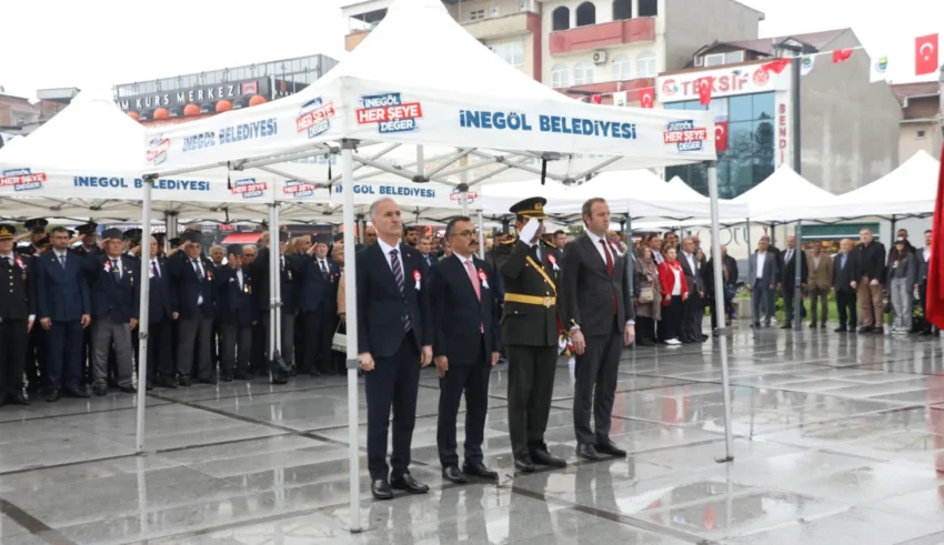 Çelenk törenine; Kaymakam Eren Arslan, Belediye Başkanı Alper Taban, ilçe protokolü, siyasi partiler, sivil toplum kuruluşları temsilcileri, öğrenciler ve vatandaşlar katıldı. Çelenk sunumuyla başlayan 29 Ekim Cumhuriyet Bayramı töreninde sırasıyla; Kaymakamlık, Garnizon Komutanlığı ve İnegöl Belediye Başkanlığı çelenkleri anıta bırakıldı. Daha sonra saygı duruşunda bulunularak İstiklal Marşı okundu. Törenin burada sona erdi.