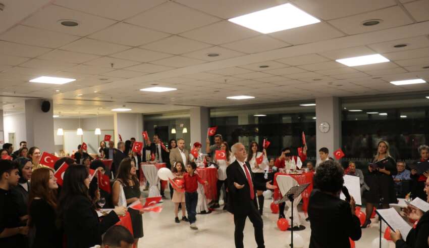 Açılış konuşmanın ardından başlayan etkinlikte, oda üyelerinden oluşan Türk Sanat Müziği korosu sahne aldı. Atatürk’ün sevdiği şarkıların seslendirildiği bölümde davetliler ellerinde Türk bayraklarıyla koroya eşlik etti.