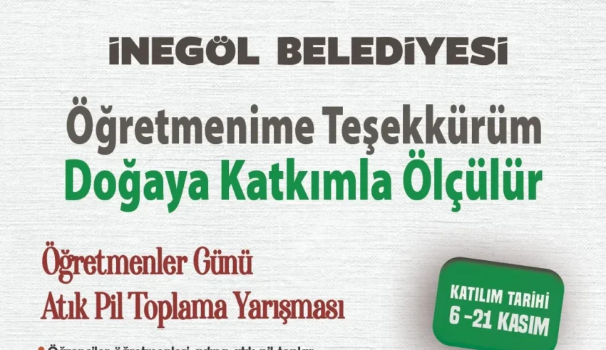 İnegöl Belediyesi, 24 Kasım Öğretmenler Günü için atık pil toplama kampanyası başlattı. Öğrencilerin öğretmenleri adına atık pil toplayarak katılacağı yarışmada, ilk 3’e giren sınıfların öğretmenlerine hediyeler verilecek. Birinci olan sınıfa ayrıca öğretmeniyle birlikte Gastro İnegöl’de yemek ikram edilecek.