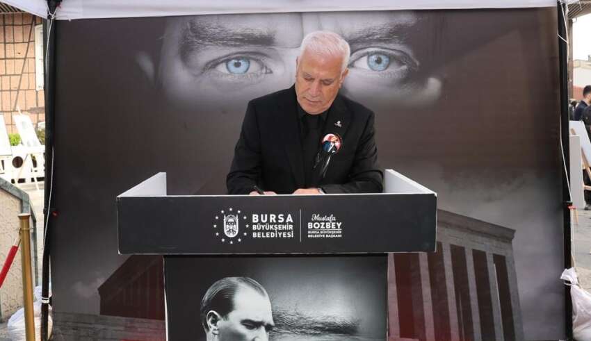 Bursa Büyükşehir Belediye Başkanı Mustafa Bozbey de resmi törenlerin ardından ‘anı defteri’ standını ziyaret ederek Atatürk ile ilgili duygu ve düşüncelerini satırlara döktü. ‘Ulu Önderim, Sevgili ATAM;’ diyerek cümlelerine başlayan Başkan Mustafa Bozbey, anı defterine şunları yazdı: