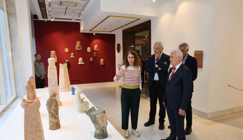 Ziyaretin sonunda Başkan Mustafa Bozbey, sergiye katkılarından dolayı Küratör Yasemin Bay’a hediye verdi.