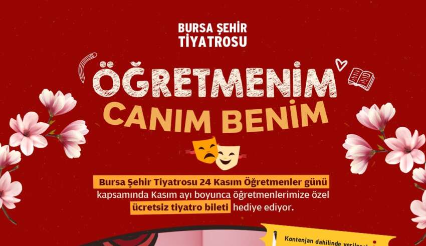 Bursa Büyükşehir Belediyesi Şehir Tiyatrosu, ülkemizin geleceği olan çocukları yetiştiren öğretmenler için 30 Kasım’a kadar olan tüm oyunları ücretsiz olacağını açıkladı. 24 Kasım Öğretmenler Günü dolayısıyla alınan karar kapsamında İstanbul Şehir Tiyatrosu’nun Bursa’da sahneleyeceği eserler de yer alıyor.