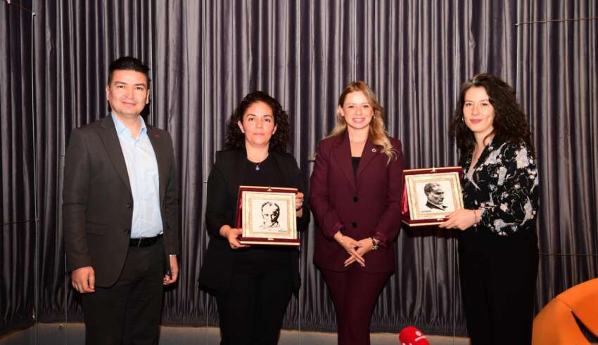 Söyleşinin ardından Osmangazi Belediyesi Basın Yayın ve Halkla İlişkiler Müdürü Süleyman Çavlı, Esra Türker ve Hatice Nur Derya’ya Atatürk plaketi takdiminde bulundu.