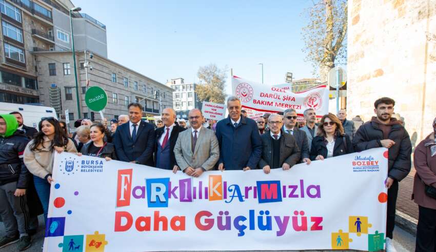 Dünya Engelliler Günü kapsamında ‘Engelli Farkındalık Yürüyüşü’ düzenlendi. Ulu Cami önünde bir araya gelen özel gereksinimli bireylere Bursa Büyükşehir Belediye Başkanı Mustafa Bozbey’i temsilen Büyükşehir Belediyesi Genel Sekreter Yardımcısı Mehmet Yıldız, Bursa Vali Yardımcısı Mustafa Güney, Bursa Kent Konseyi Başkanı Prof. Dr. Ertuğrul Aksoy, sivil toplum kuruluşlarının temsilcileri ve vatandaşlar eşlik etti. ‘Farklılıklarımızla Daha Güçlüyüz’ yazılı pankart taşıyan vatandaşlar, ellerindeki dövizlerle ‘Engel olma, farkında ol’ mesajı verdi. Büyükşehir Belediye Bandosu’nun da eşlik ettiği yürüyüş, Atatürk Anıtı’nda sona erdi. Saygı duruşu ve İstiklal Marşı’nın ardından çelenk sunumu gerçekleştirildi.