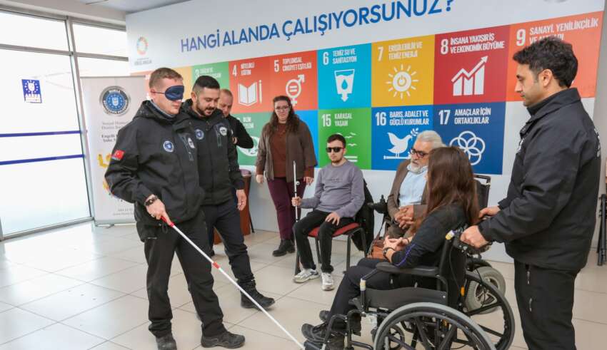 BAM ekibine, Afet İşleri Dairesi Başkanlığı ve Sosyal Hizmetler Dairesi Başkanlığı Engelli Hizmetleri Şube Müdürlüğü iş birliğiyle afet öncesinde, anında ve sonrasında engelli bireylere nasıl yaklaşılacağı konusunda eğitim verildi. ‘Kimseyi Geride Bırakmıyoruz’ sloganıyla Afet Koordinasyon Merkezi’nde yapılan (AKOM) eğitimde, özel gereksinimli bireylerin güvenli, hızlı ve doğru şekilde nasıl tahliye edileceği anlatıldı. Dünya Engelliler Günü kapsamında gerçekleştirilen programda, özel ihtiyaçların değerlendirilmesi ve hassasiyetlerin operasyonel süreçlere entegre edilmesi konuşuldu. Eğitimin sonunda görme engelli bireylerin isteği doğrultusunda telsizin nasıl kullanıldığı da anlatıldı.