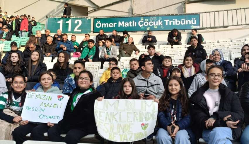 Maç saatinin yaklaşmasıyla birlikte Atatürk Spor Kompleksi Matlı Stadyumu’na getirilen çocuklar, Ömer Matlı Çocuk Tribünü’nde Bursaspor coşkusuna ortak oldu. Yeşil beyazlı ekibin, sahasında Aliağa Futbol A.Ş. ile karşılaştığı ve sahadan golsüz eşitlikle ayrıldığı mücadelede 90 dakika boyunca Bursaspor’a destek veren çocuklar, heyecan dolu anlar yaşadı.