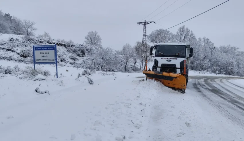 İnegöl Belediyesi, kar yağışının şiddetini arttığı günlerde 126 personel ve 30 araçla sahada. İnegöl’de kapalı köy yolu bulunmazken, ekipler 2 vardiya şeklinde 24 saat çalışmalarını sürdürüyor.