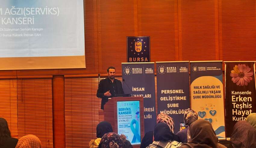 Ocak ayının Serviks Kanseri Farkındalık Ayı olarak kabul edilmesi kapsamında, Bursa Büyükşehir Belediyesi tarafından kadın çalışanlara yönelik ‘Serviks Kanseri Bilinçlendirme ve Farkındalık Etkinliği’ düzenlendi. İnsan Kaynakları ve Eğitim Dairesi Başkanlığı ile Sağlık İşleri Dairesi Başkanlığı iş birliğinde, İl Sağlık Müdürlüğü’nün desteğiyle gerçekleştirilen program, Atatürk Kültür Merkezi Merinos Yerleşkesi’nde yapıldı.