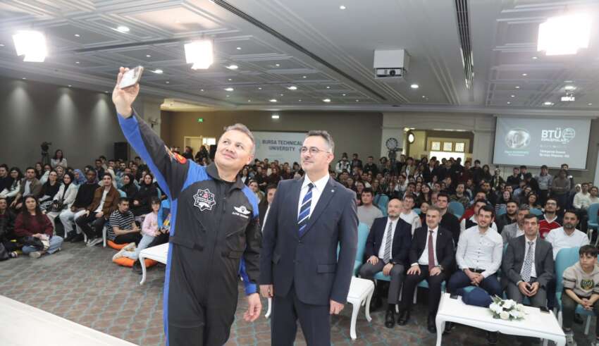 Türkiye’nin ilk astronotu Alper Gezeravcı, Bursa Teknik Üniversitesinde öğrencilerle buluşarak Türkiye’nin insanlı ilk uzay misyonu kapsamında 22 gün süren uzay yolculuğunu ve Milli Uzay Programı kapsamındaki hedefleri anlattı. Uluslararası Uzay İstasyonu’nda gerçekleştirilen bilimsel deneylerden, eğitim sürecine kadar pek çok detayı paylaşan Gezeravcı, gençlere; “Bu bir varış değil başlangıç; bundan sonra bu hikâyeyi siz yazacaksınız” mesajı verdi.