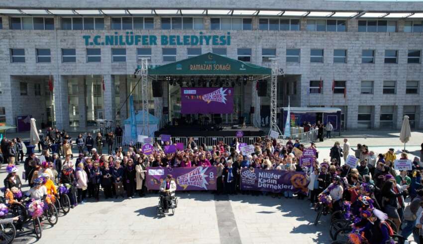 Nilüfer Belediyesi ve Nilüfer Kent Konseyi, 8 Mart Dünya Kadınlar Günü’nde geniş katılımlı bir yürüyüş ve basın açıklaması düzenledi. “Eşitlik Ses İster, Biz Buradayız” sloganıyla Nilüfer Kent Konseyi önünde başlayan yürüyüşte kadınlar, eşitlik ve direniş sloganları eşliğinde Nilüfer Belediyesi Halk Evi önündeki Cumhuriyet Meydanı’na kadar yürüdü. Etkinliğe, Nilüfer Belediye Başkan Yardımcıları Serpil Altun ve Bukle Erman ve meclis üyeleri ile Nilüfer Belediye Başkanı Şadi Özdemir’in eşi Nuray Özdemir de katıldı. Korteje, Nilüfer Kent Konseyi Bisiklet Çalışma Grubu da bisikletleriyle eşlik etti.