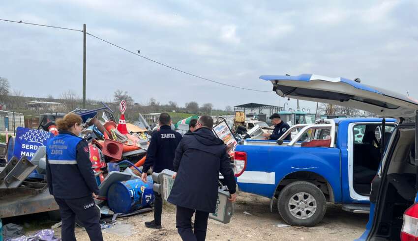 Nilüfer Belediyesi zabıta ekipleri, Görükle, Beşevler, 29 Ekim Mahallelerinde cadde ve kaldırımlarda yaya geçişini engelleyen duba, bayrak gibi materyalleri topladı.